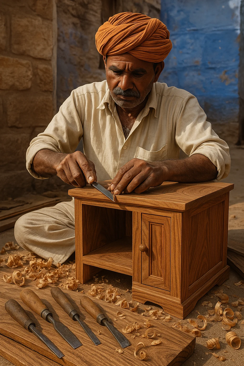 Jodhpur, the city of forts and furniture, is where our woodwork takes form. Each piece is shaped by hand in local workshops steeped in tradition. From raw sheesham and mango wood to smooth, polished finishes — Our furniture is a reflection of rugged beauty and regal heritage. Local artisans cut, carve, and assemble with an unmatched eye for detail.